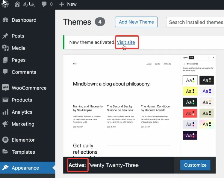 I don’t have too many options to change my fonts on my website and I want to add it directly with codes . so I’m going to activate this template then I click on visit website and here I want to change this font to my preferred font.