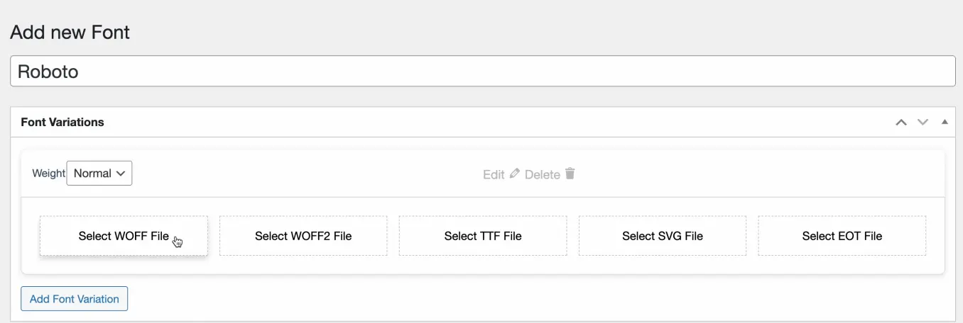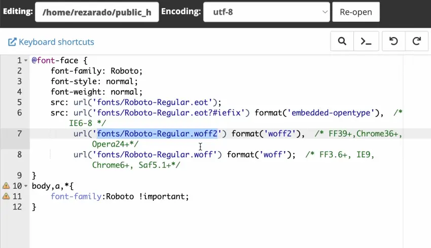 We can add our uploaded our our custom font files and upload them all on our website for example here I had Roboto with five different formats so I’m going to delete these codes.