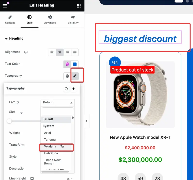 I can choose every font I want I can change sizes font weight font transform style and everything I want for different parts of my website site also I can select update click on update and then I can go to edit with Elementor for a specific page for example I want to apply just one font to one of my texts on my website so I’m going to edit with Elementor for my homepage and here I have a title for example this title and I can select style in typography section I can select which font I want for especially for this title for example this one and it’s selected just for this title