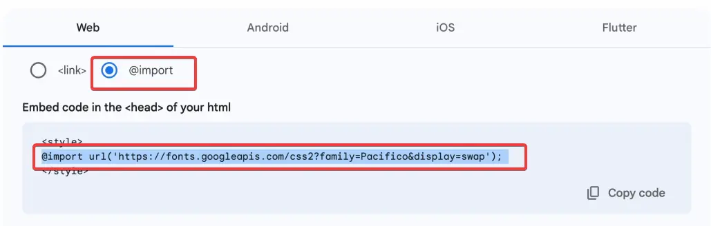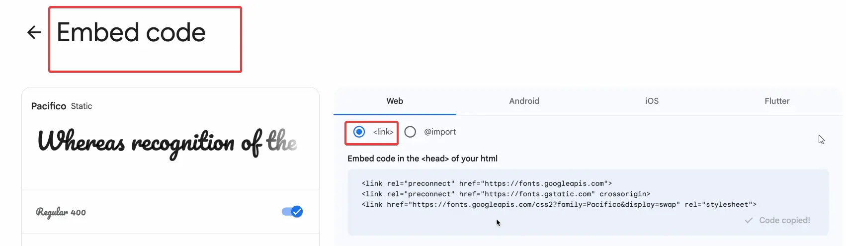 And we have to click on get font and get embed code for web link copy code first of all we have to add this part of code to our template header.php.
