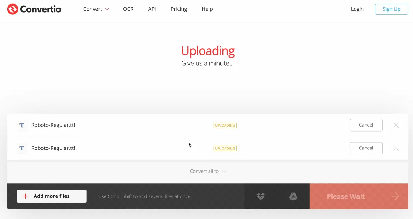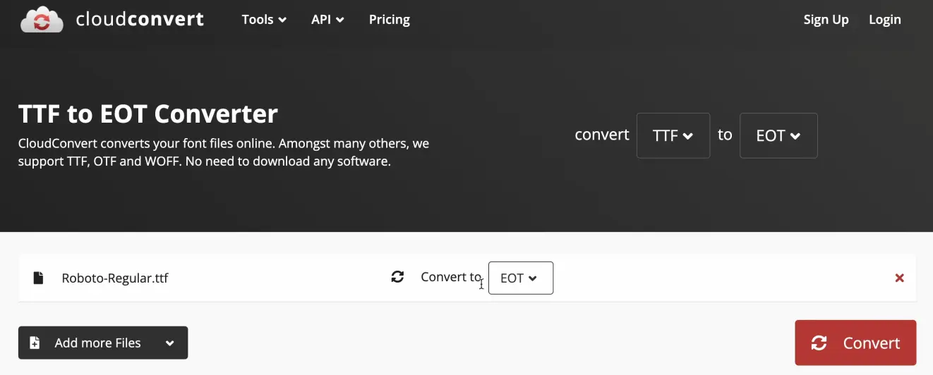 And so I’m going to ttf to woff2 online and Cloud Convert can do it also I’m selecting add more files and I want to convert it to WOFF2 and click on convert it’s going to convert my file and then I can download these files so I have five different formats of this file and I can upload them all here in my WordPress dashboard