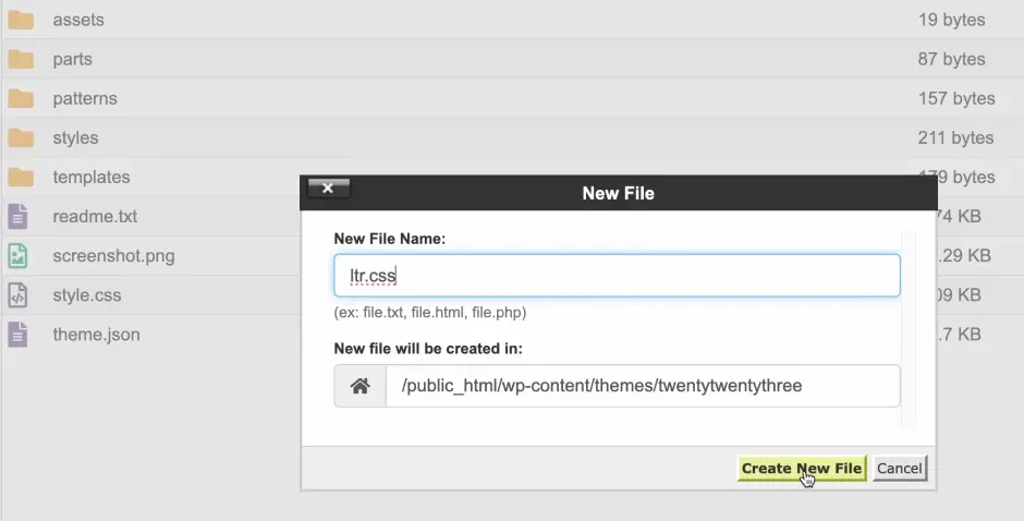 so we have to go to our Cpanel file manager or our DirectAdmin file manager then we will go to wp-content and themes and here I have to select my theme folder my theme directory is 2023. So I’m going to this folder and here I have to add a new file. which file? if your language is RTL for example Persian or Arabic or Pashto or something like this you have to create rtl.css file and if you are using LTR languages for example French English something like this you have to enter ltr.css or left-to-right.css.