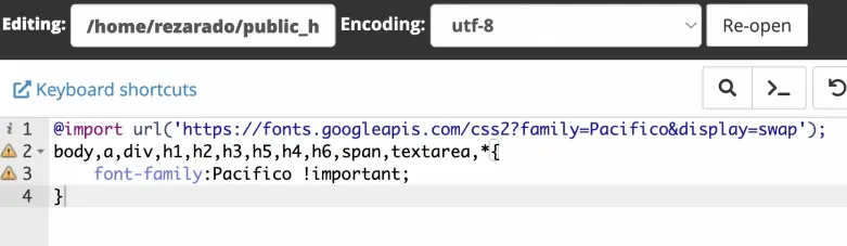 So in the next we have to for example type body comma a comma div comma H1 H2 H3 H4 H5 H6 span textarea and also we can use star to include all of them and open this CSS style so we have to enter font-family for example Pacifico something like this and then we can type !important here to make it important and then save changes.