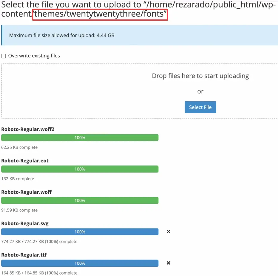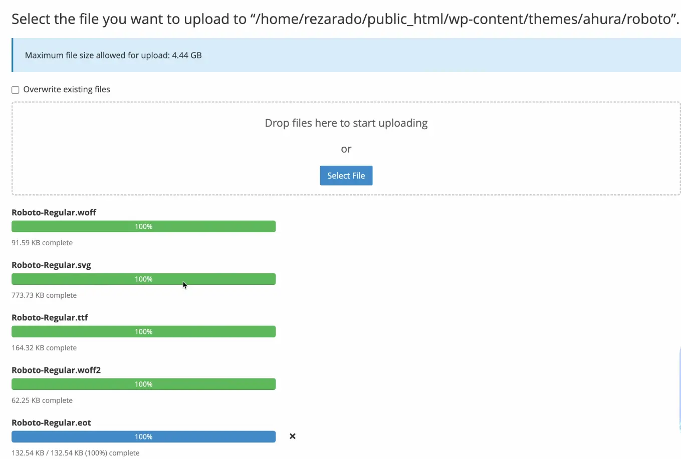 I’m going to my Cpanel file manager and if you don’t know how to log to your Cpanel or your DirectAdmin you have to search in my website I’ve uploaded a video about install WordPress and I’ve taught you how to log to your hosting control panel. I’m going to public_html here in wp-content in my themes folder. I’m going to my theme folder .And here I can upload a new folder for example Roboto and I can go to this folder and upload all of my files here for example SVG ttf WOFF and also I can download WOFF2 and the EOT file and upload them all here so I have five formats of my fonts here in Roboto directory