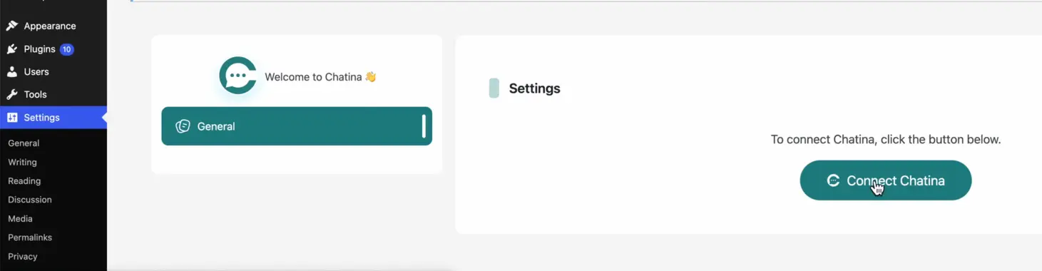 after activating this plugin we will have new menu under the settings menu by the name chatina and I have to click on chatina menu and click connect chatina to connect my website to chatina it says do you accept to connect your chatina account with this email address and I’ll say yes connect it to chatina then my chatina is account is connected to my website easy peasy
