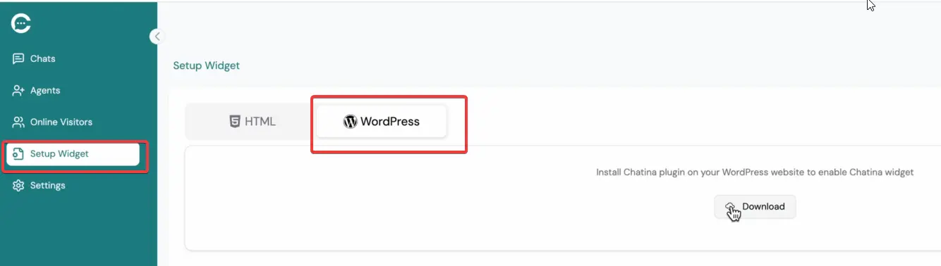 Then here is chatina application with this application you can connect to your customers or your visitors online from the left sidebar here I can click on setup widget and then I will click my website platform here our platform is WordPress then I have to to download my WordPress plugin here