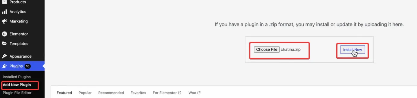 from plugins add new plugin menu in my WordPress dashboard I have to click upload plugin and choose my file here I will choose the downloaded file and click on install now to install chatina plugin on my website so I have to activate plugin.